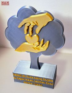 Ovaj pehar je izrađen od PLA plastike. Materijal: PLA filament (PLA je filament koji je najrašireniji u industriji 3D printanja zbog svoje stabilnosti, niske i pristupačne cijene te utjecaja na okoliš i ekologiju, jer se dobiva iz biorazgradivih elemenata kao što su kukuruzni škrob, šećerna trska, krumpirov škrob i sl. Zbog toga je vrlo ekološki prihvatljiv u odnosu na druge materijale (ABS ili PVA). Koristi se u medicini za implantate u tijelu, za pakiranje hrane i jednokratan pribor za jelo. Ima nisku otpornost na toplinu, počinje omekšavati na oko 50 °C, pa jedino na što morate pripaziti je ne izlagati predmete visokim temperaturama)